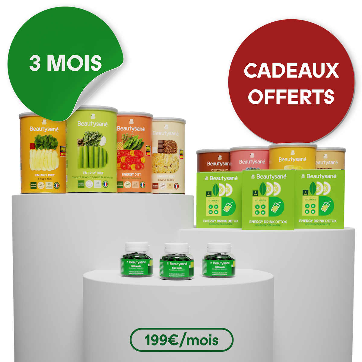 Brûle excès : Extrait de feuilles de thé vert (Camellia sinensis), tunique d’origine végétale (hypromellose, colorant : complexe cuivre-chlorophylle), extrait de graines de guarana (Paullinia cupana, caféine naturelle), caféine naturelle, tartrate de L-carnitine, chlorure de chrome.