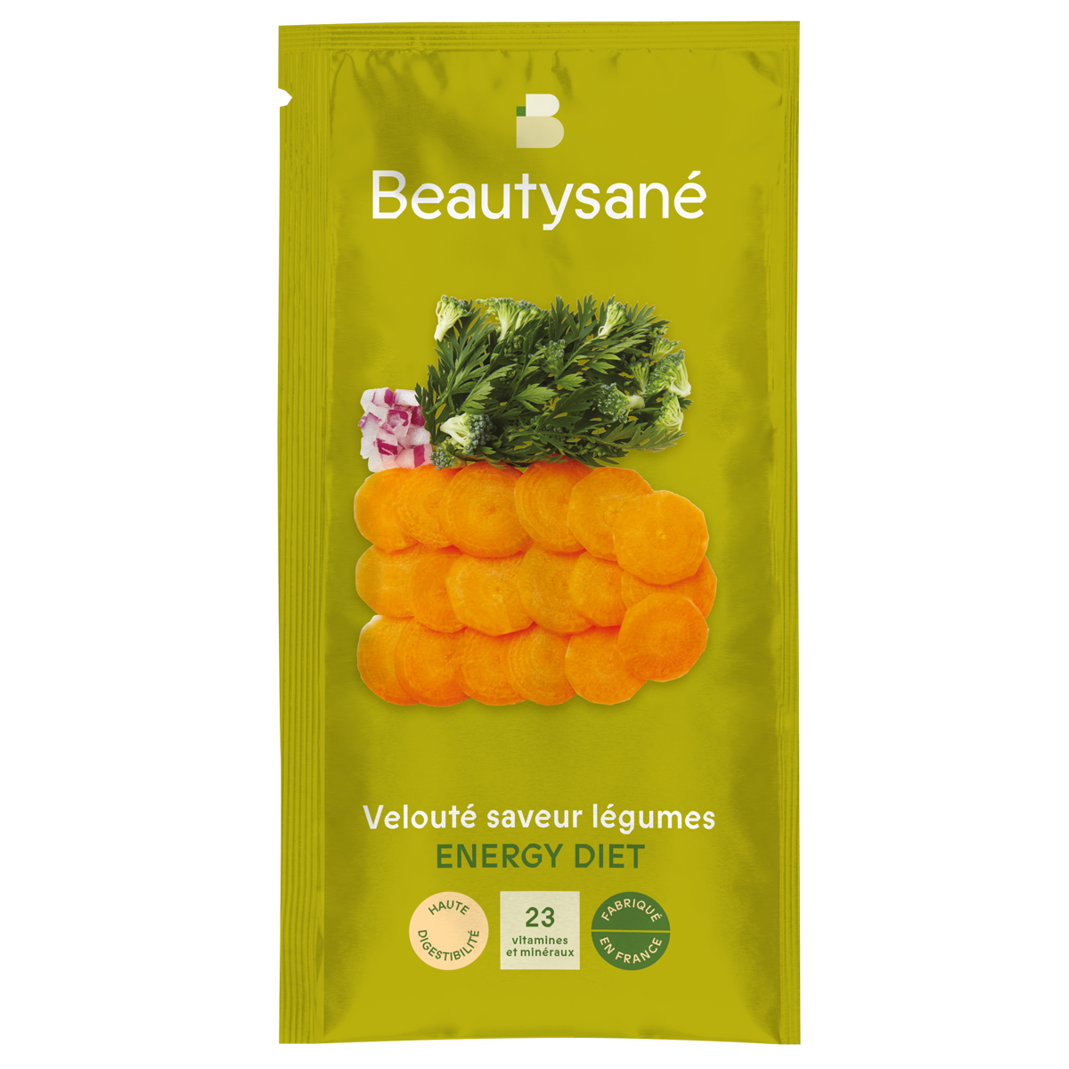 Protéines de soja, huiles végétales (huile de soja, huile de colza, sirop de glucose, protéines de lait, arôme naturel), fibres d’acacia, légumes en proportions variables (11%) : épinard, tomate, brocoli, carotte, oignon, céleri ; amidon, maltodextrine, sel, protéines de pois, citrate tripotassique, épaississants : gomme de cellulose, gomme tara ; inuline de chicorée, carbonate de magnésium, épices : ail, curry (céleri), origan ; vitamines : C, E, PP, A, B5, K1, D3, B6, B1, B12, B9, biotine; fumarate de fer, citrate de zinc, gluconate de manganèse, gluconate de cuivre, préparation enzymatique, sélénite de sodium, iodure de potassium.