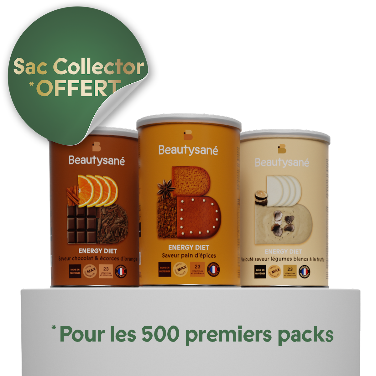 Velouté de légumes blancs à la truffe : Protéines de soja, topinambour, huiles végétales (huile de soja, huile de colza, sirop de glucose, protéines de lait, arôme naturel), légumes en proportion variable : céleri rave, oignon, patate douce ; amidon, fibres d’acacia, protéines de lait, arômes (lait, céleri), citrate tripotassique, épaississants : gomme de cellulose, gomme guar ; inuline de chicorée, farine de maïs torréfié, sel, carbonate de magnésium, protéines de pois, poivre, préparation enzymatique ; macis, clou de girofle, vitamines : C, E, PP, A, B5, D3, B6, K1, B1, B12, B9, biotine ; fumarate de fer, citrate de zinc, gluconate de manganèse, gluconate de cuivre, sélénite de sodium, iodure de potassium.